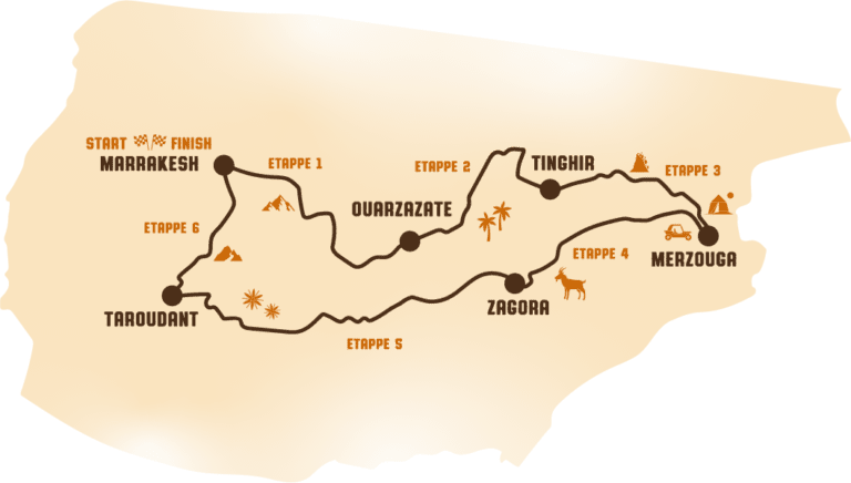 - De rally start dan effectief op zondagochtend met een eerste kennismaking van het voertuig en de check-in procedure, op vrijdagavond komen we terug aan in Marrakesh waar je de auto direct terug kan inleveren, dan zit het er definitief op. Je kan dus zelf nog bijboeken of in de late avond al direct een terugvlucht boeken.